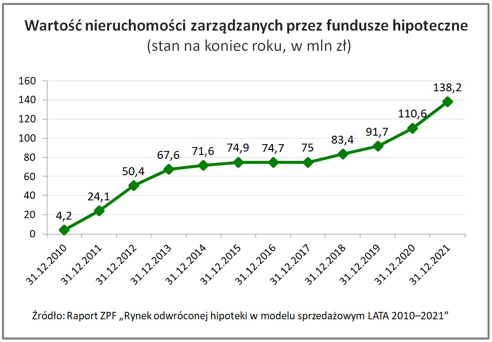 Fundusze hipoteczne zrzeszone w ZPF na koniec 2021 roku zarządzały 371 umowami z seniorami. Średnia wysokość świadczenia pieniężnego z tytułu renty dożywotniej wynosiła na koniec 2021 roku 826,6 zł miesięcznie. Fundusze od początku swojej działalności do końca 2021 roku wypłaciły seniorom 26,4 mln zł świadczeń. W całym 2021 roku wypłacono aż 3,68 mln zł, co stanowi najwyższy wynik w ciągu 11 lat. Jednocześnie to o 76 proc. więcej niż w roku 2020.