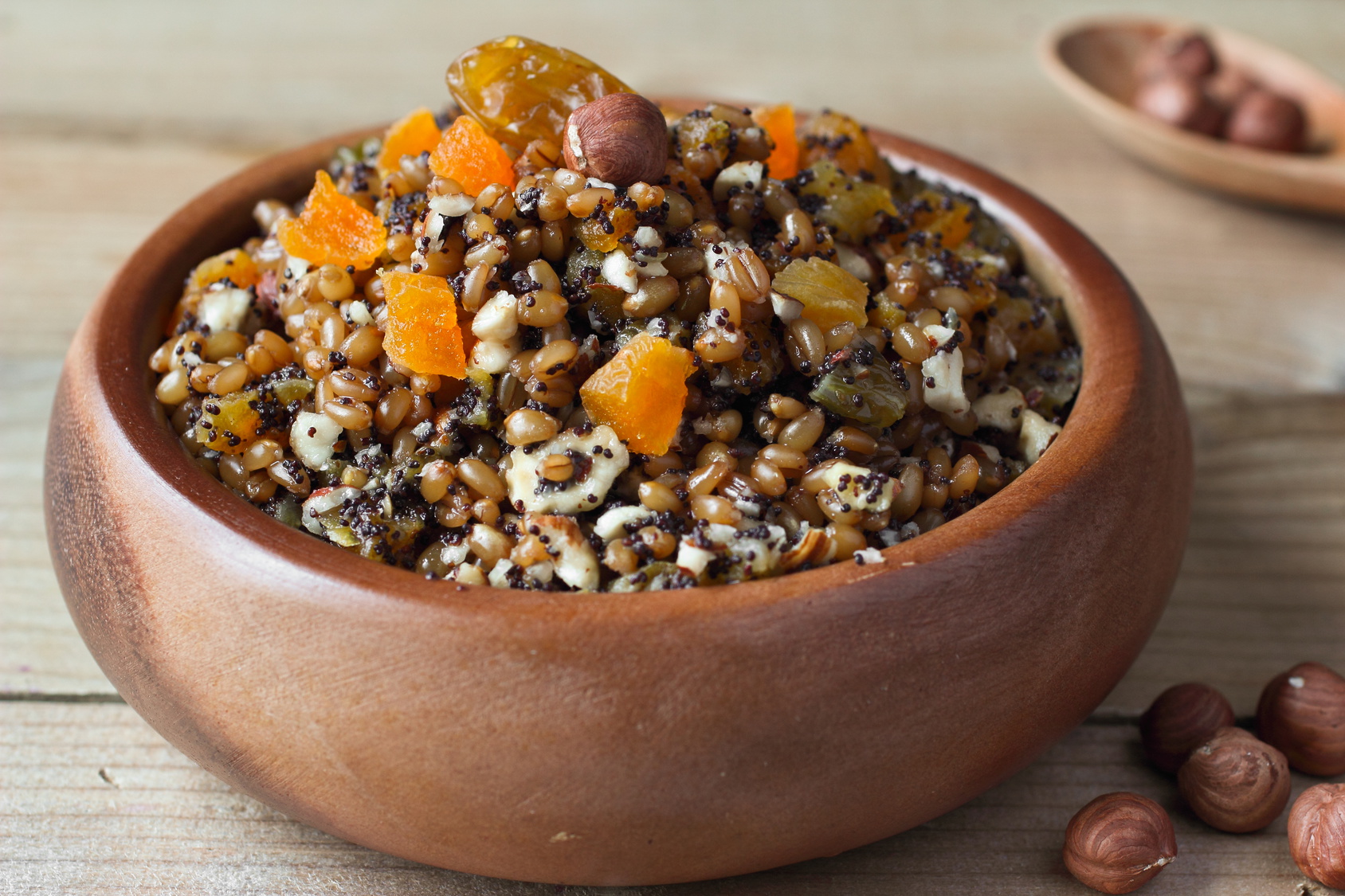 1 szklanka maku, 1 szklanka ziaren pszenicy, 1 szklankę mleka, 1/2 szklanki cukru pudru, 1/2 szklanki miodu, 20 dekagramów posiekanych orzechów laskowych, 10 dekagramów siekanych migdałów, 3 łyżki rodzynek sułtańskich, po 5 fig i daktyli, nieco soli, otarta skórka z cytryny lub pomarańczy.