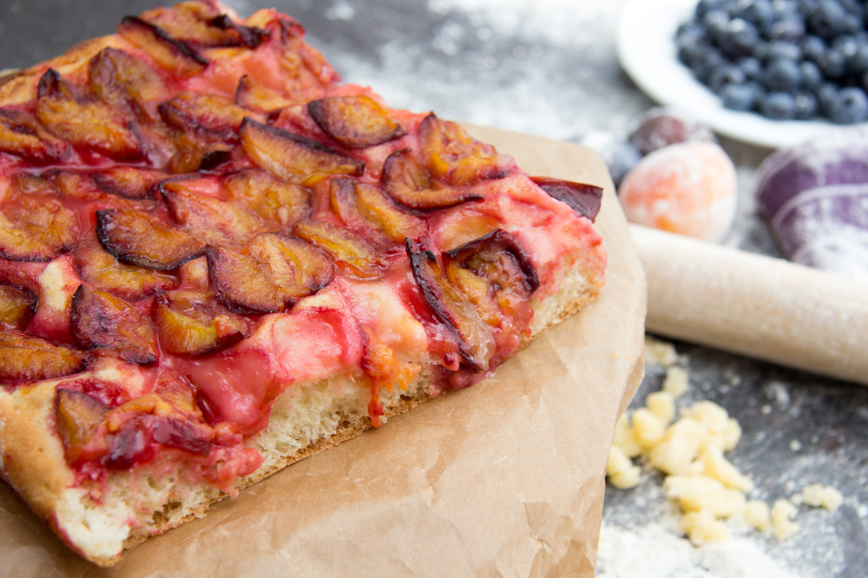 Wszystkie składniki zmieszać ze sobą dużą, drewniana łyżką, dodając je w podanej kolejności. Kiedy powstanie w miarę jednolita masa, wylać ją na wyłożoną papierem do pieczenia blachę o przeciętnym rozmiarze. Na wierzch ciasta ułożyć owoce, nie wciskając zbyt mocno w masę. Piec ok. 45 min. w 180°. Po tym czasie przeprowadzić test „suchej wykałaczki”. Jeśli ciasto jest nadal wilgotne, dopiec jeszcze 5-10 min.