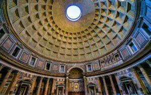 Udając się z Placu Weneckiego w przeciwnym kierunku do Forum Romanum natrafimy na jedną z najbardziej niezwykłych i zapierających dech w piersiach budowli – Panteon – jeden z najlepiej zachowanych zabytków starożytności. Najprawdopodobniej była to świątynia poświęcona wszystkim bogom. Największe wrażenie robi wnętrze świątyni i jego wspaniała kopuła o średnicy 44 metrów, pokryta kasetonami, na której środku znajduje się 9-metrowy otwór – tzw. oculus. Ten otwór to jedyne źródło naturalnego światła w Panteonie, przez który w dzień wpada snop promieni słonecznych, a w bezchmurne noce – blask księżyca.
