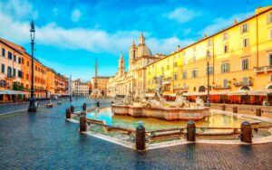 Piazza Navona to perła baroku i powszechnie uważany jest za najpiękniejszy plac Rzymu. Eliptyczny kształt placu to pozostałość po mieszczącym się w tym miejscu w starożytności hipodromie. Główną atrakcją placu jest malownicza Fontanna dei Quattro Fiumi (fontanna czterech rzek) z posągami symbolizującymi 4 wielkie rzeki: Nil, Ganges, Rio de la Platę i Dunaj.