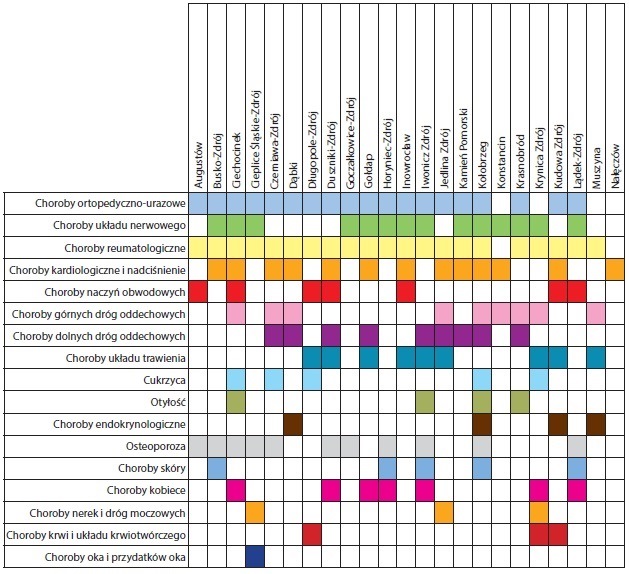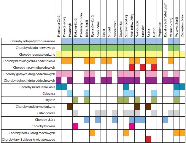 A gdzie możemy zostać skierowani przez lekarza? Wszystko zależy od schorzenia, bo każde z polskich uzdrowisk ma swoje specjalizacje. W poniższej tabeli można sprawdzić, które schorzenia leczone są w poszczególnych miejscowościach.